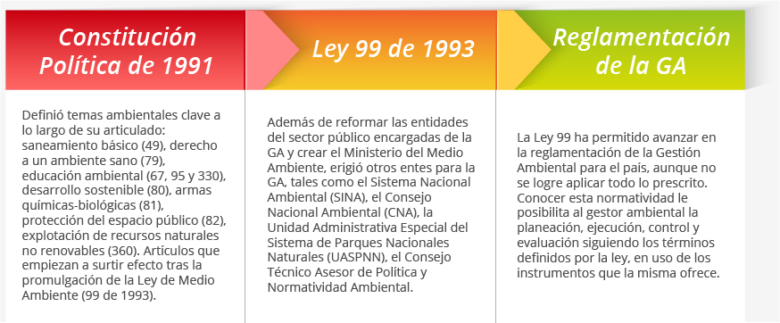 Desde 1884 el Estado colombiano ha venido produciendo legislación en temas ambientales. De ese año data el Decreto 0935 sobre la explotación de bosques nacionales. Para 1968 se crea un órgano que resultó esencial en la Gestión Ambiental del país, el Instituto de Desarrollo de los Recursos Naturales Renovables (INDERENA). Este ente desaparece a comienzos de los años noventa, tras la creación de las Corporaciones Autónomas Regionales (CAR).
