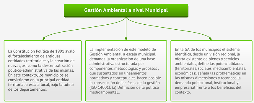 La Gestión Ambiental comprende un proceso que involucra fases (planeación-ejecución-control), escalas (nacional, regional, departamental, municipal) y actores (públicos, privados, ONG, sociedad civil), por lo que su estructura expresa múltiples intereses e intencionalidades, que deben estar en correspondencia con el ordenamiento jurídico-político y la administración territorial