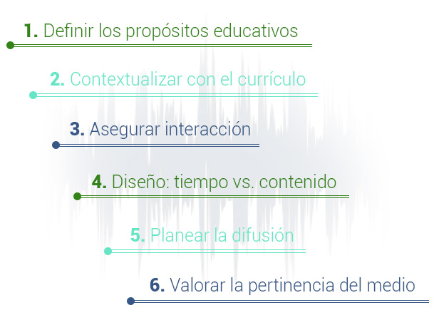 Al decidirse por el uso del audio como herramienta educativa, el educador asume los retos tecnológicos, narrativos y de calidad, lo que le representa necesariamente incorporar los protocolos de diseño, producción y uso de los medios en el marco de una metodología y pedagogía en la que se prioricen los objetivos de aprendizaje.